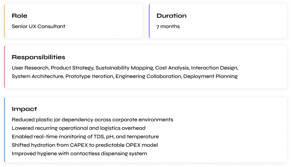 To design Rolan R-200 effectively, I needed to understand why corporate hydration systems fail operationally — not just how water purifiers function technically.