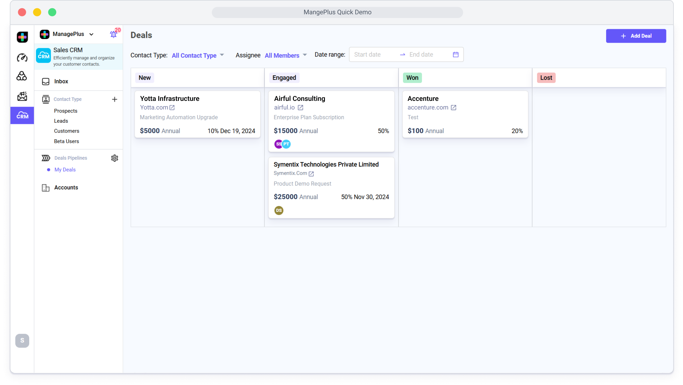 Manage all your Customer activities in inbuild CRM. Never miss a lead
